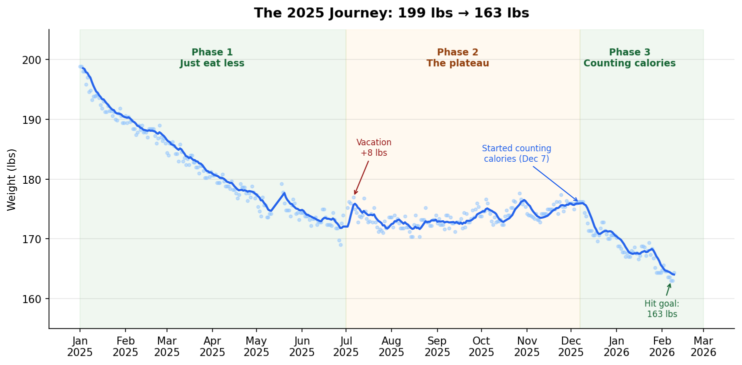 The results were immediate. December through January, the weight dropped consistently. I hit 170 right before Christmas, and kept going. By early February, I hit my 2025 goal weight of 163 lbs.