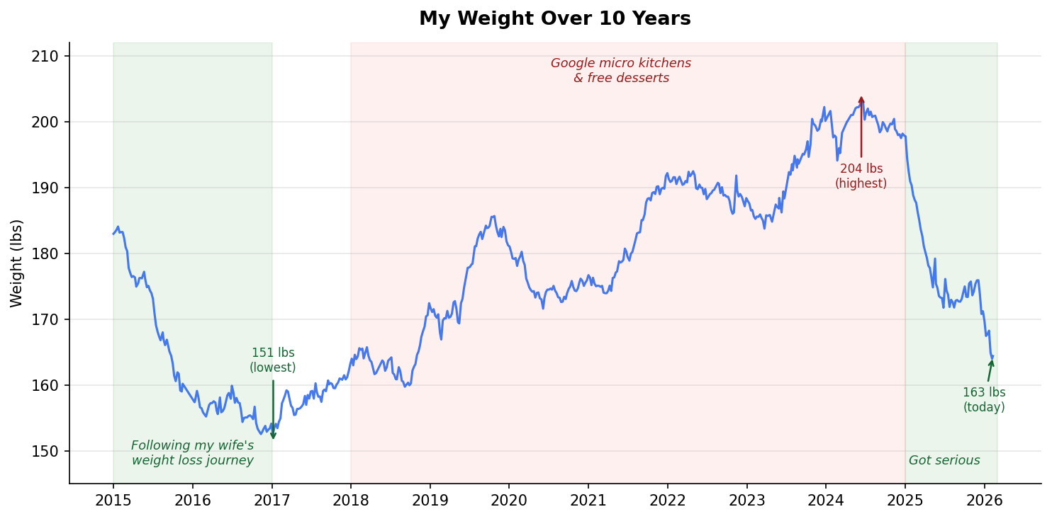 For the next six months, I bounced between 170 and 176. I'd get down to 172, have a work dinner, potluck, or a vacation, and pop back up to 175. The same mental tricks that got me through Phase 1 weren't enough anymore. What got me here wasn't going to get me to my goal weight (pre-Google weight).